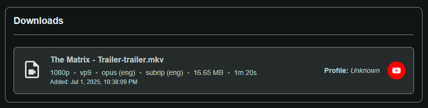 Unknownif the trailer was downloaded using an older version of Trailarr (< 0.6.0-beta) or outside of Trailarr. - Profile name is shown as